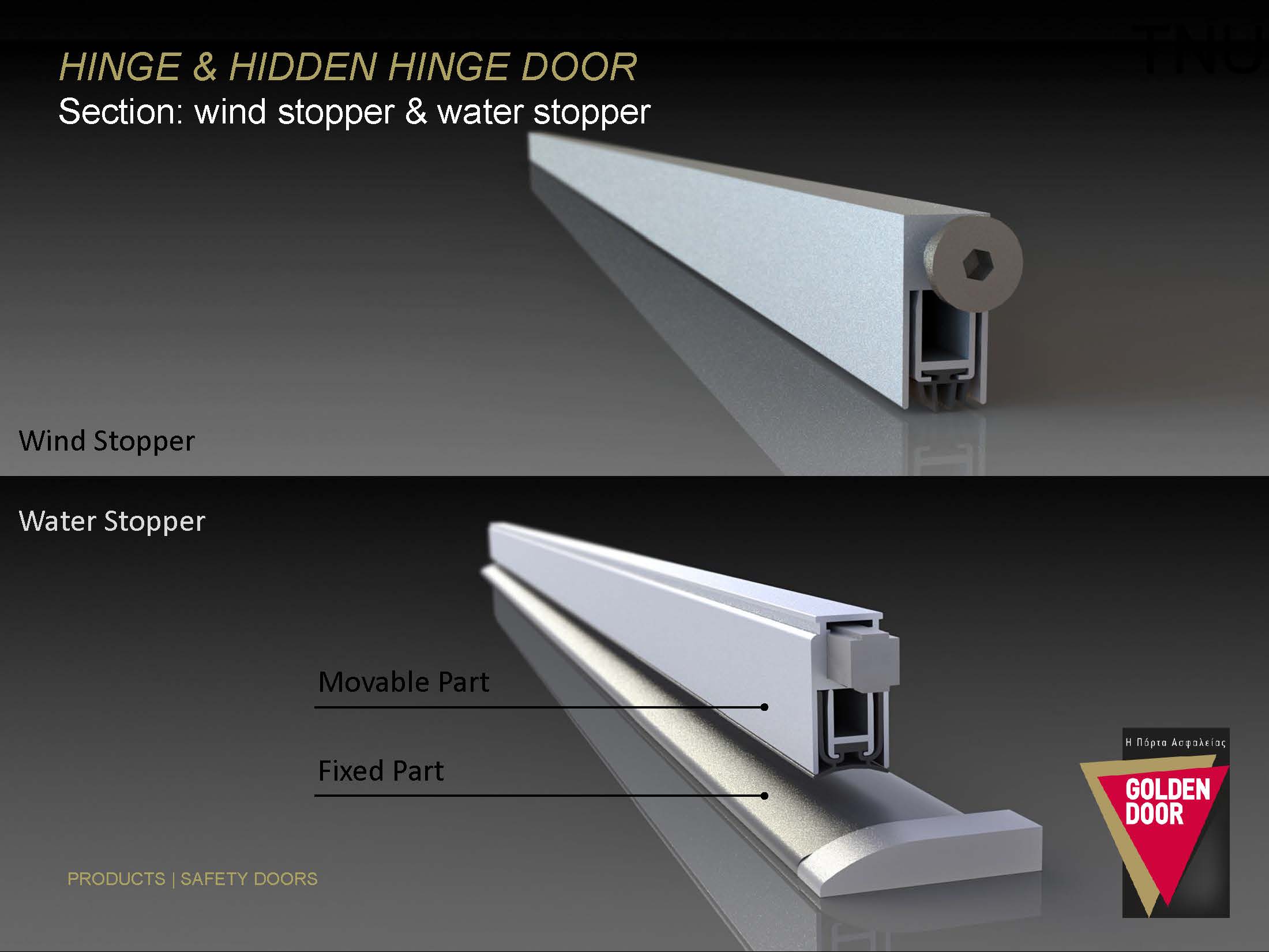 Etanseitatea perfecta a usii este realizata cu ajutorul a 4 chedere perimetrale (2 canatul foii de usa si 2 pe toc) si a sistemului de prag etans.