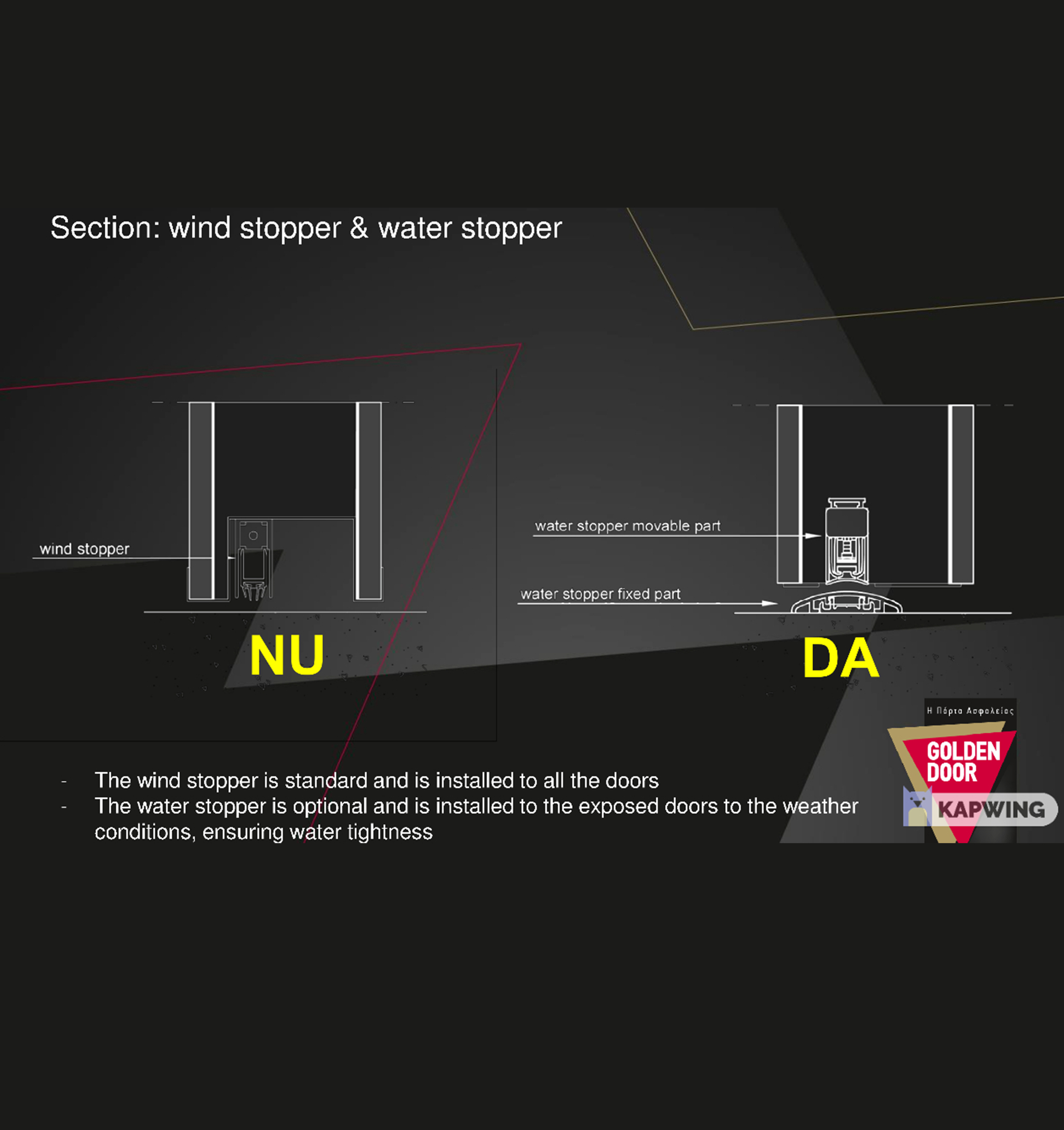 Sistemul de prag etans si chederele perimetrale (1 cheder pe toc + 1 cheder pe foaia de usa) asigura foii de usa, etanseitate perfecta